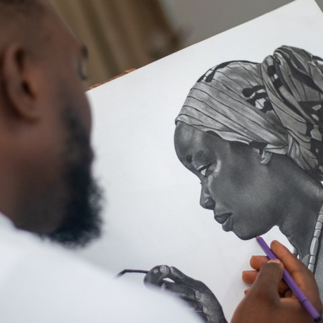 His photo realistic pencil and charcoal portraits highlight a deep understanding of the contemporary and native black experience, intertwining emotion and identity.